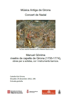 29 de desembre de 2012 7 de la tarda Concert a la Catedral Girona Presentació d'obres inèdites del mestre Manuel Gònima – Lleida 1710 – Girona 1792. |